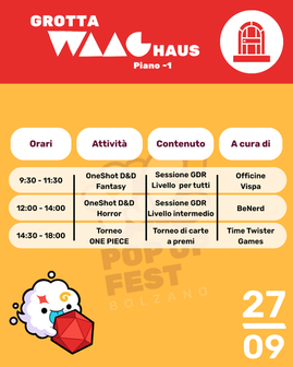 - cosa: una giornata per immergersi nel vastissimo mondo della cultura pop, attraverso workshop e talk sul fumetto, il cinema, il gioco di ruolo e tanto altro!